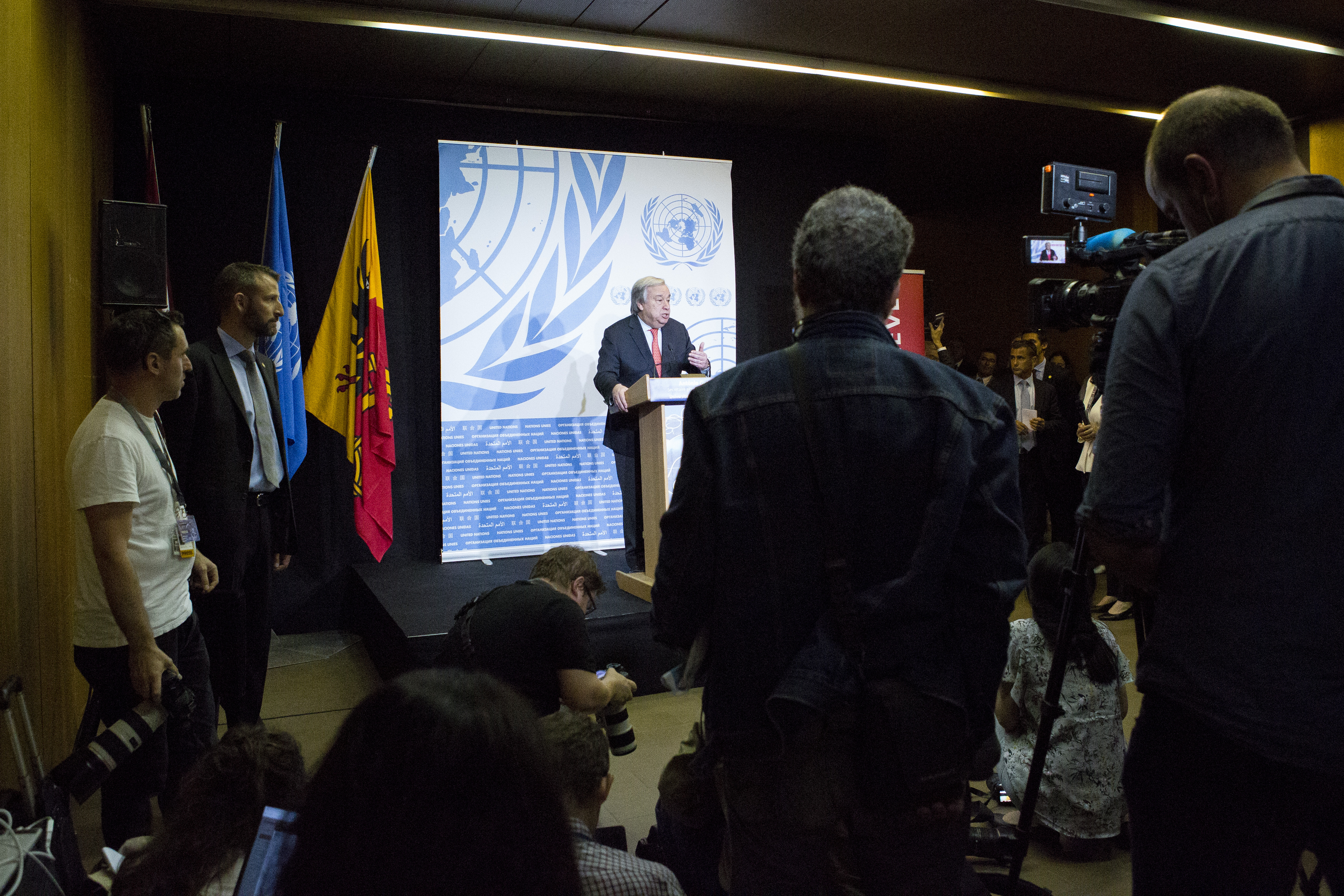 Rencontre entre le secrétaire général de l’ONU, António Guterres, et les médias à Uni Dufour, dans le...