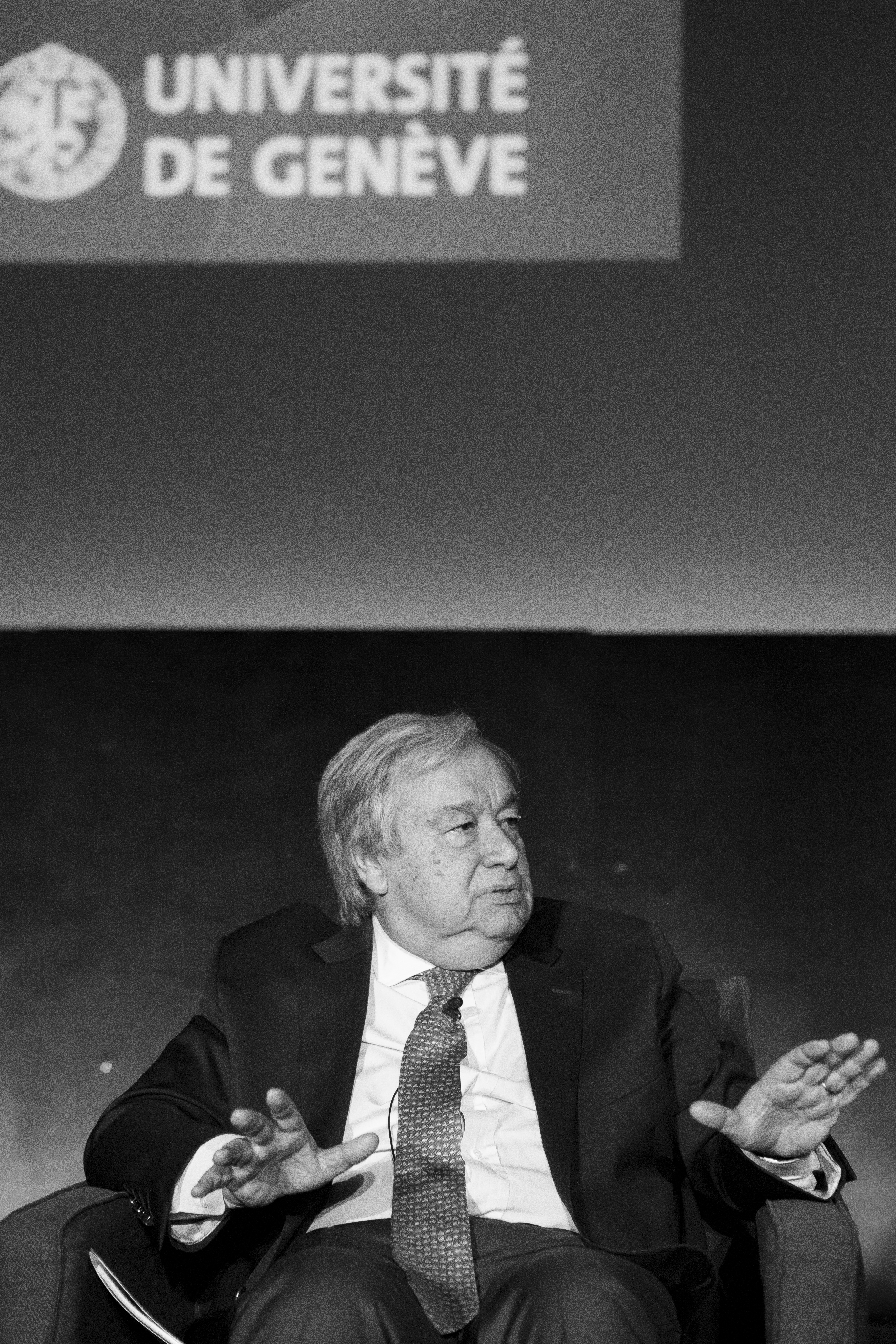 Le secrétaire général de l’ONU, António Guterres, à Uni Dufour dans le cadre d’une conférence sur le...
