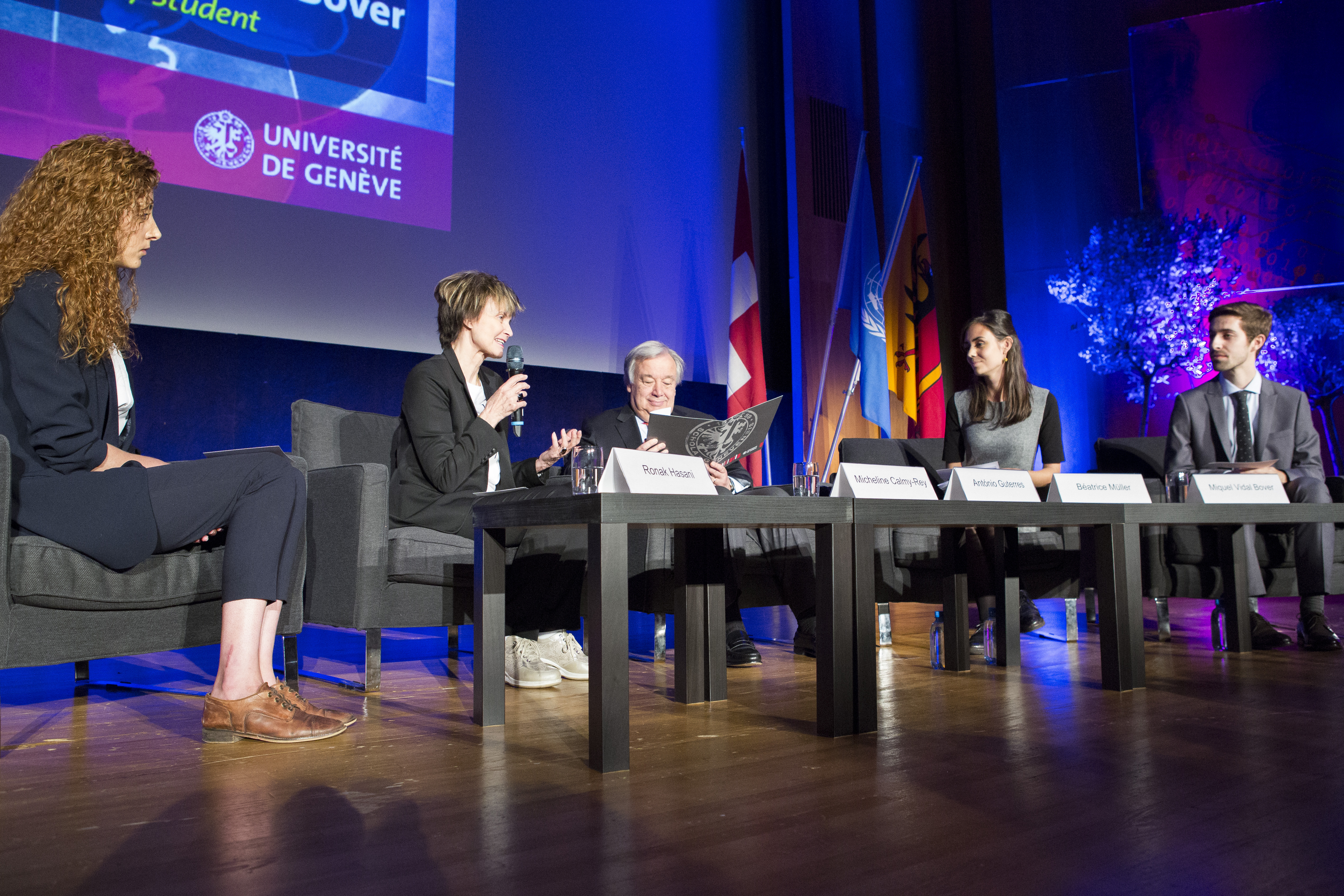 Discussions à Uni Dufour entre le secrétaire général de l’ONU, António Guterres, et des étudiants du cours de Micheline Calmy-Rey, ancienne présidente de la Confédération et professeure invitée à l’UNIGE, au sujet du désarmement.