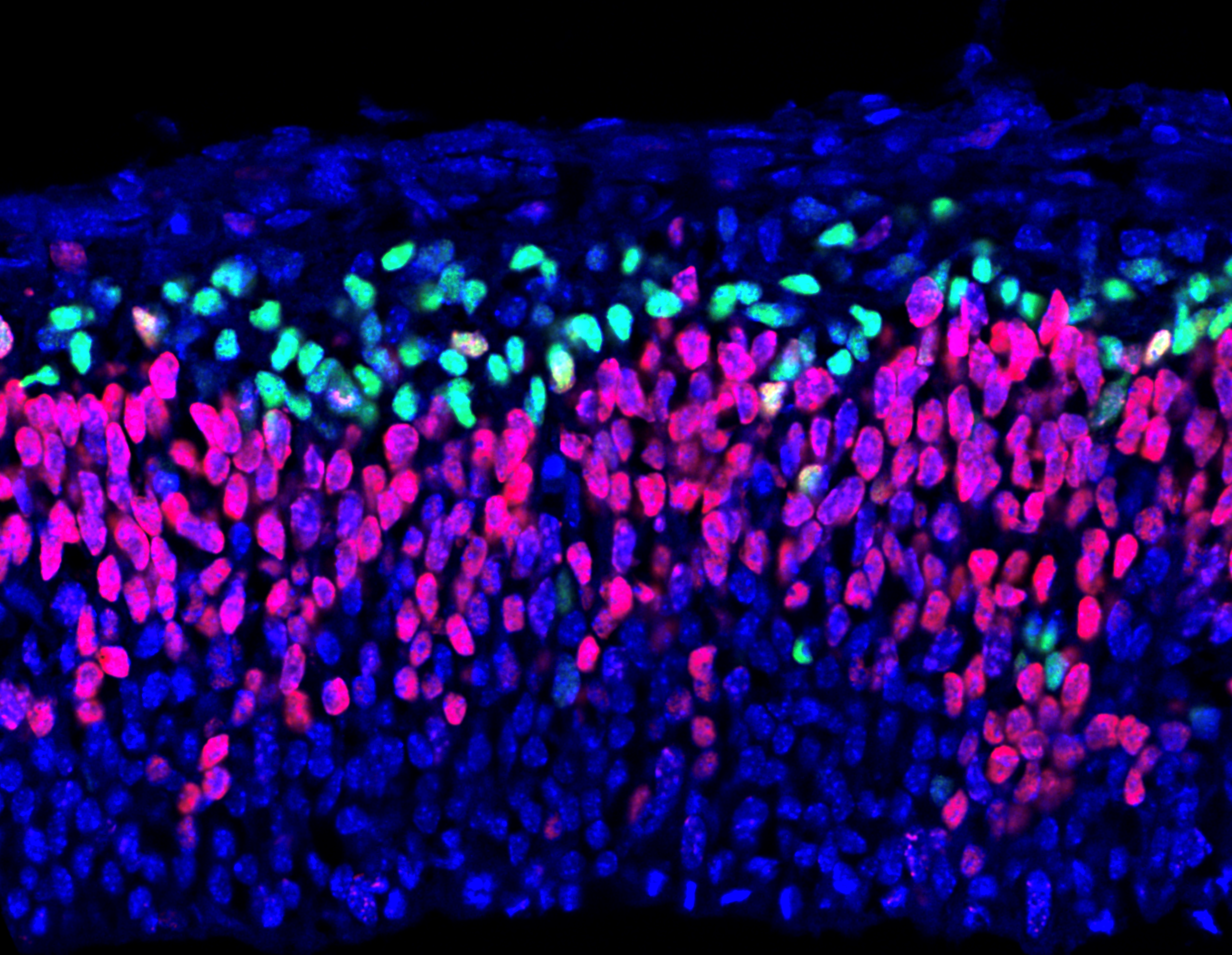 Cellules progénitrices (en rouge) se divisant pour donner naissance à des cellules neuronales filles (en vert).
