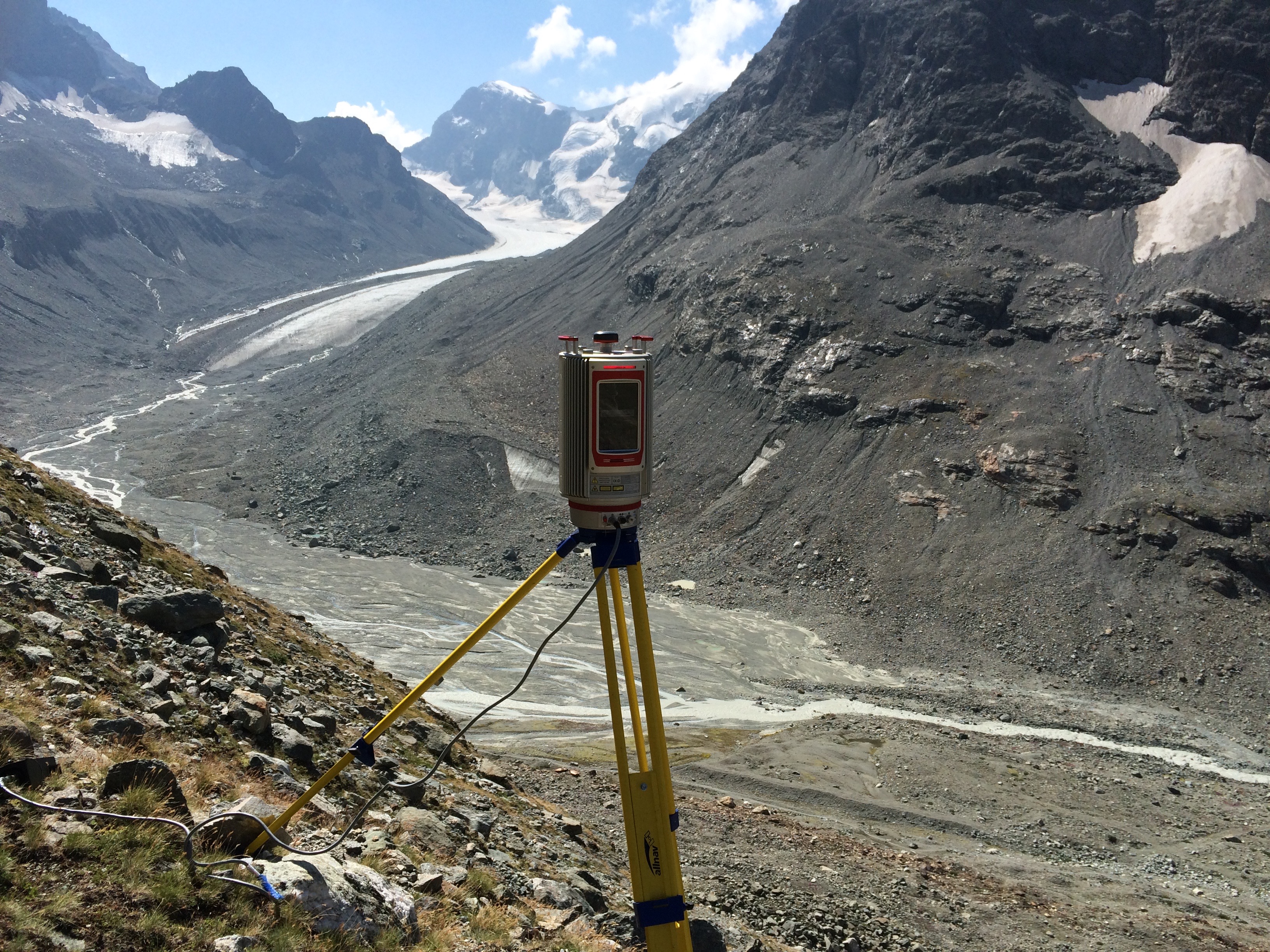 Un dispositif Lidar installé à proximité de la Cabane de Berthold (VS) procède à un scan laser 3D pour mesurer la hauteur des sédiments dans le lit de la Borgne d’Arolla (en bas) et enregistrer le retrait du glacier d’Arolla (en haut).
