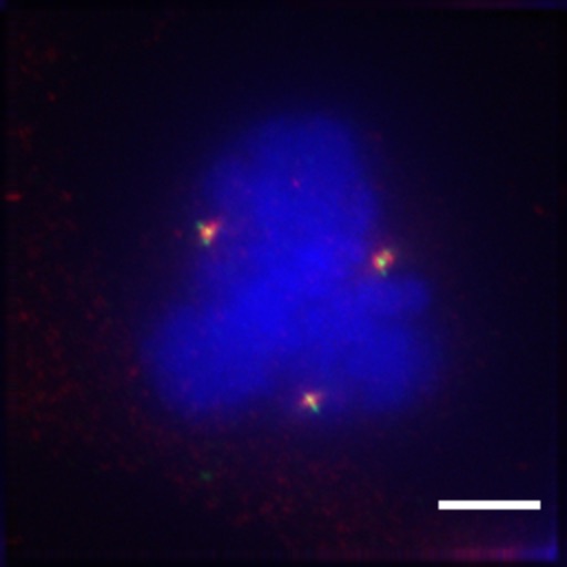 Cellules de mélanome multipolaire colorées pour les centrosomes (gamma-tubuline en rouge, centrine en vert) et l’ADN (DAPI en bleu). La barre d’échelle représente 5 µm.