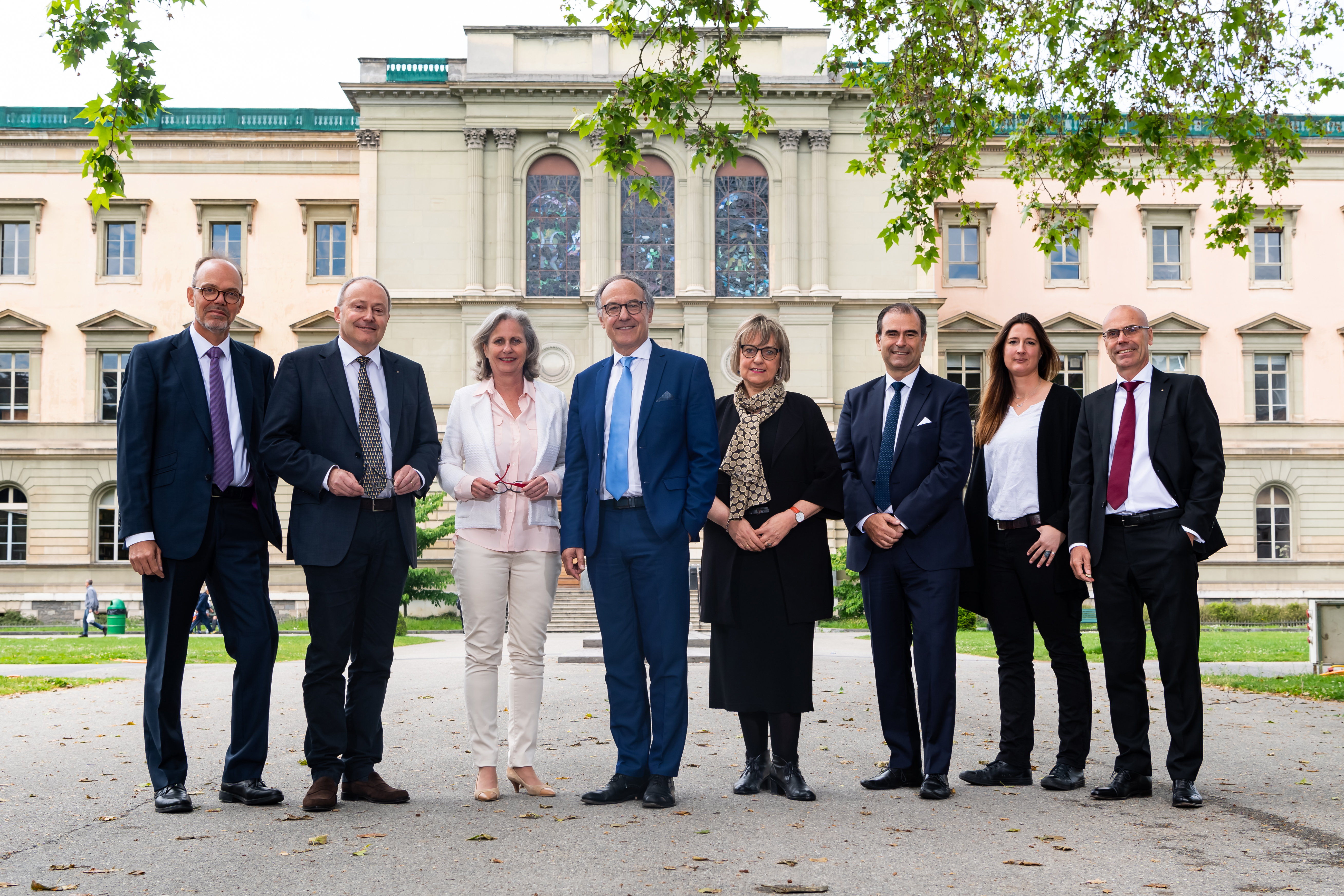 Les membres du Rectorat pour la période 2020-2023. De gauche à droite, Antoine Geissbuhler, Jean-Marc Triscone, Micheline Louis-Courvoisier, Yves Flückiger, Brigitte Gaillot, Stéphane Berthet, Céline Carrère et Didier Raboud.
