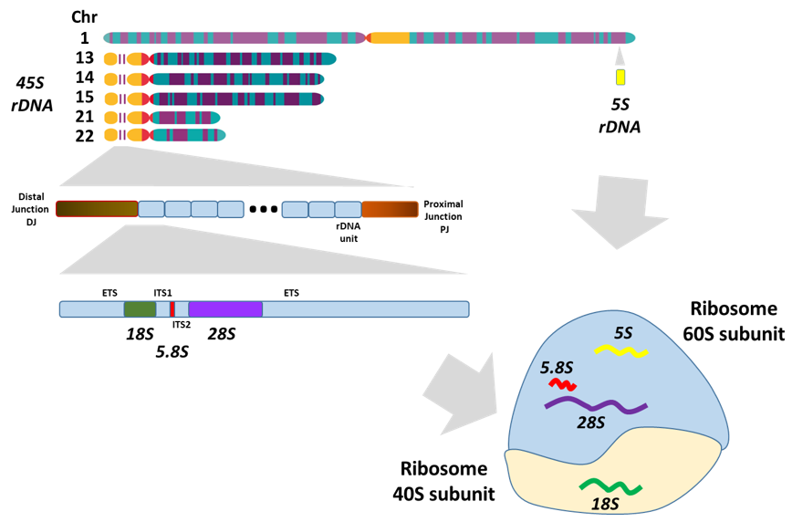 Schematic representation of the rDNA genes on the acrocentric chromosomes (13, 14, 15, 21, and 22) encoding the rRNAs that are incorporated in the ribosome, the cellular factory that makes proteins. The sequences of the yellow and red parts of the chromosomes have been reported for the first time in the Science 2022 publication, which concludes the complete sequence of the human genome.