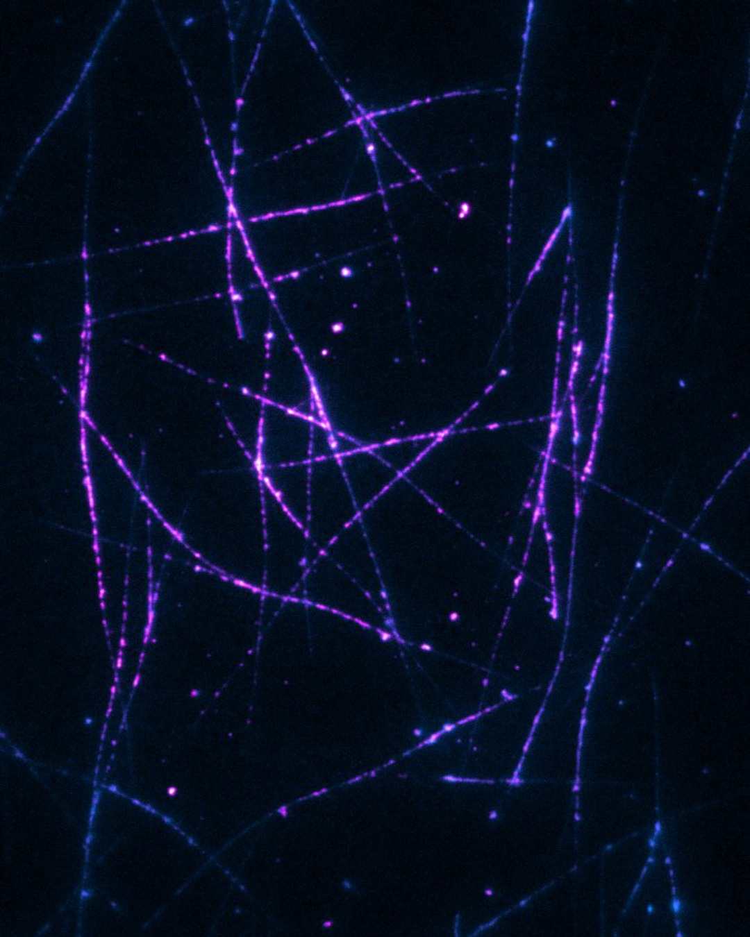 Microtubules recouverts de tubuline (magenta) et de condensats des protéines CLIP-170 et EB3 (cyan). (Aumeier et al., août 2023)