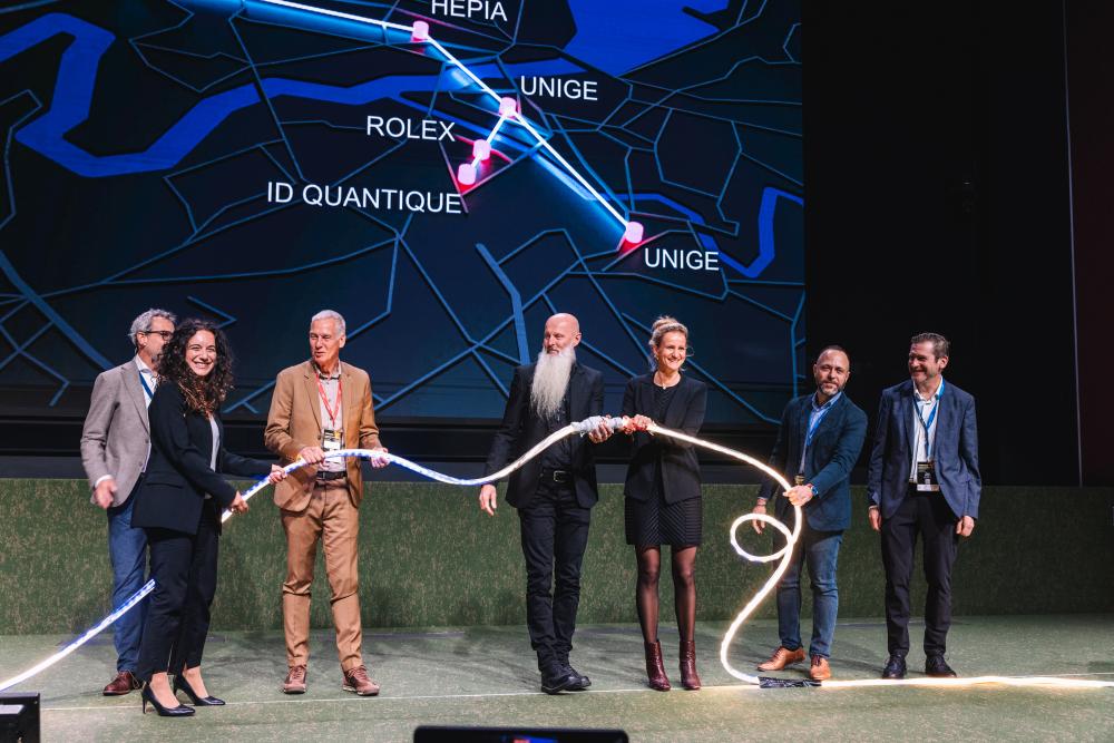 Representatives from partner organisations (HEPIA, CERN, ID Quantique, ROLEX, Canton of Geneva) launched the Geneva Quantum Network at Quantum Industry Day. In the centre, Councillor Delphine Bachman (third from right) and UNIGE researcher Rob Thew (fourth from left).