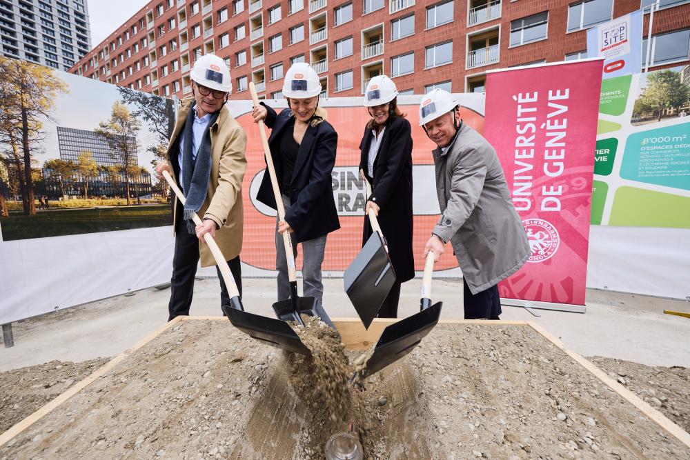 Pose de la première pierre du nouveau bâtiment de l'UNIGE à Quai Vernets, le jeudi 16 octobre 2025. De gauche à droite: Pascal Bärtschi (CEO Losinger Marazzi), Audrey Leuba (Rectrice de l'UNIGE), Anne Hiltpold (conseillère d’État chargée du Département de l’instruction publique, de la formation et de la jeunesse) et Sennen Kauz (responsable des investissements immobiliers en Suisse de Swiss Life). © Adrien Pilet