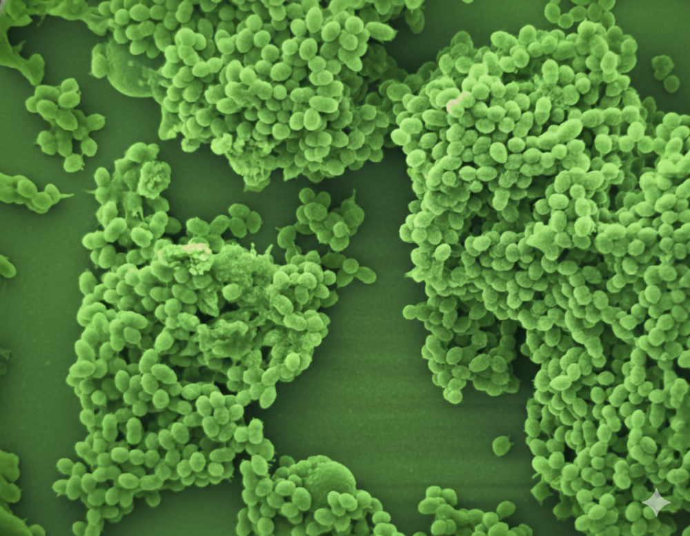 Scanning electron microscopy image of Enterococcus faecalis bacteria in a biofilm. Bacteria in a biofilm stick to each other and to surfaces, forming a protective community that helps them withstand antibiotics and immune cell attacks. Green pseudocolouring was applied with Gemini AI on the original greyscale image for vizualization purposes only. Image credit: Haris Antypas, Kenneth Ng Kok Fei
