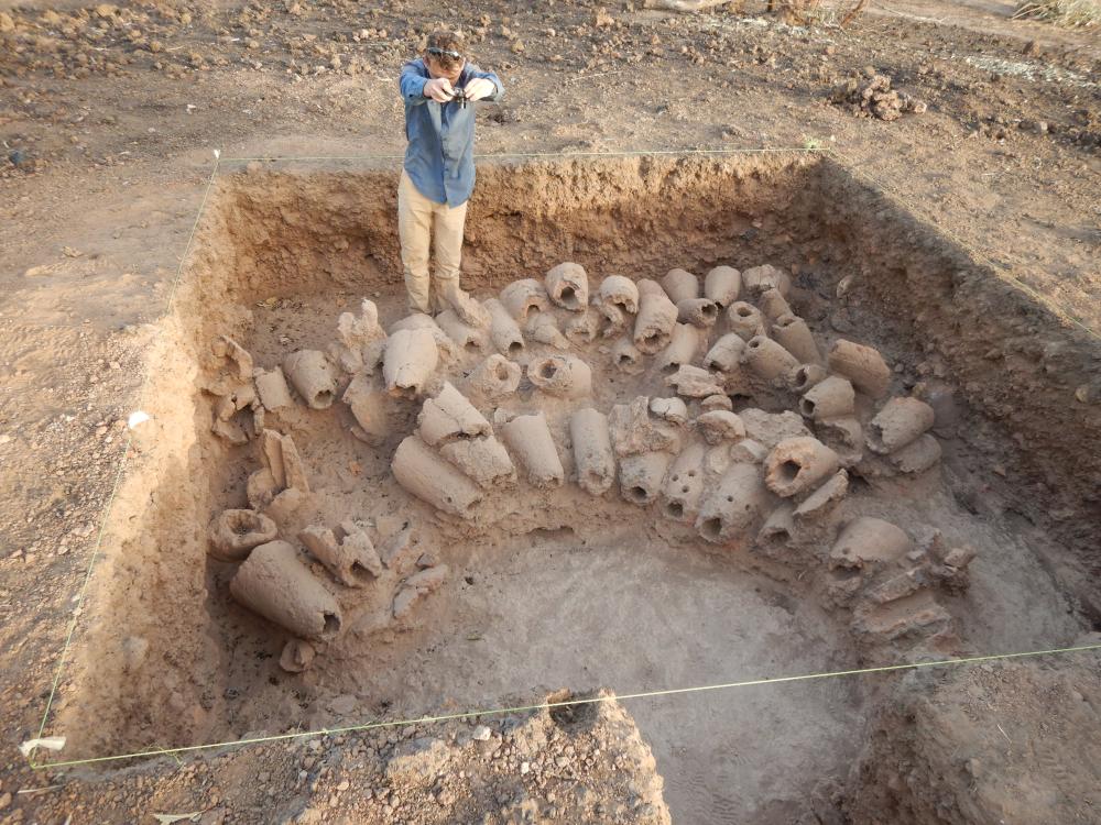 Photograph taken during the discovery of a pile of used tuyères, featuring intriguing transverse perforations, for photogrammetry purposes. © Anne Mayor