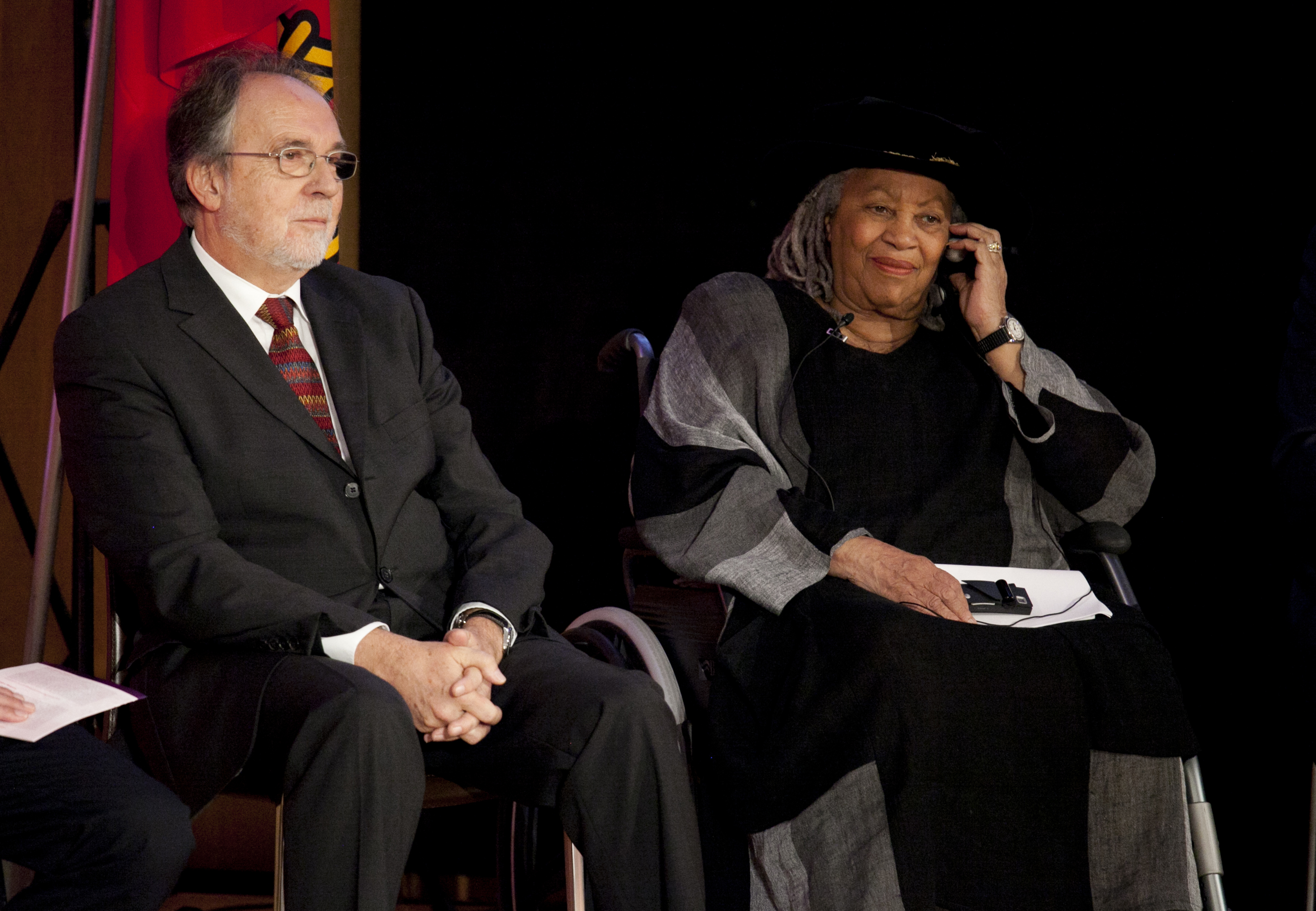 Cérémonie du Dies academicus 2011 à Uni Dufour. Dick Marty, ancien président de la Commission des droits de l'homme au Conseil de l'Europe, et Toni Morrison, romancière américaine, prix Nobel de littérature 1993, tous deux docteurs honoris causa de l'UNIGE.