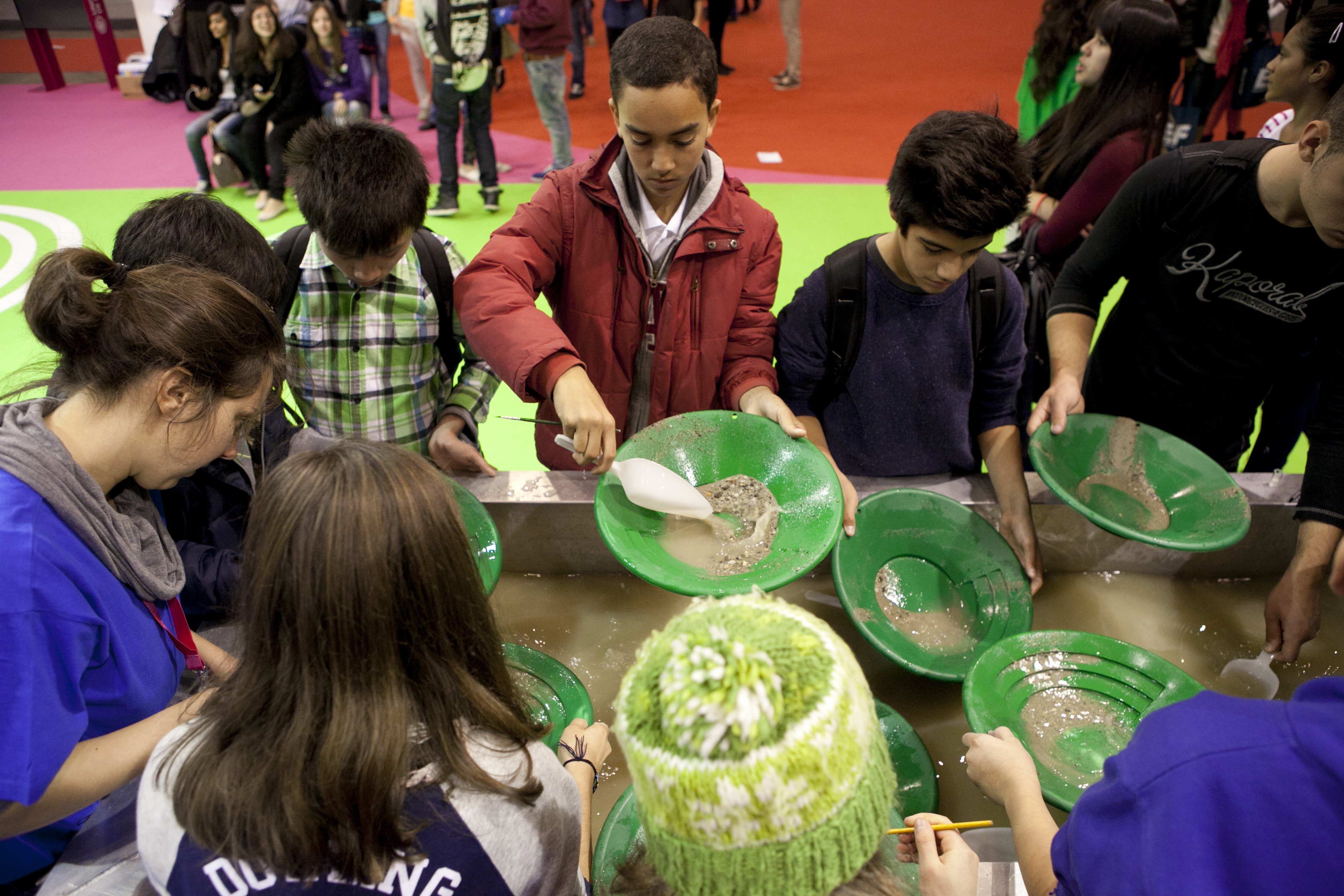 Stand de l’UNIGE à la Cité des métiers et de la formation à Palexpo. Recherche de paillettes d’or parmi des sédiments.