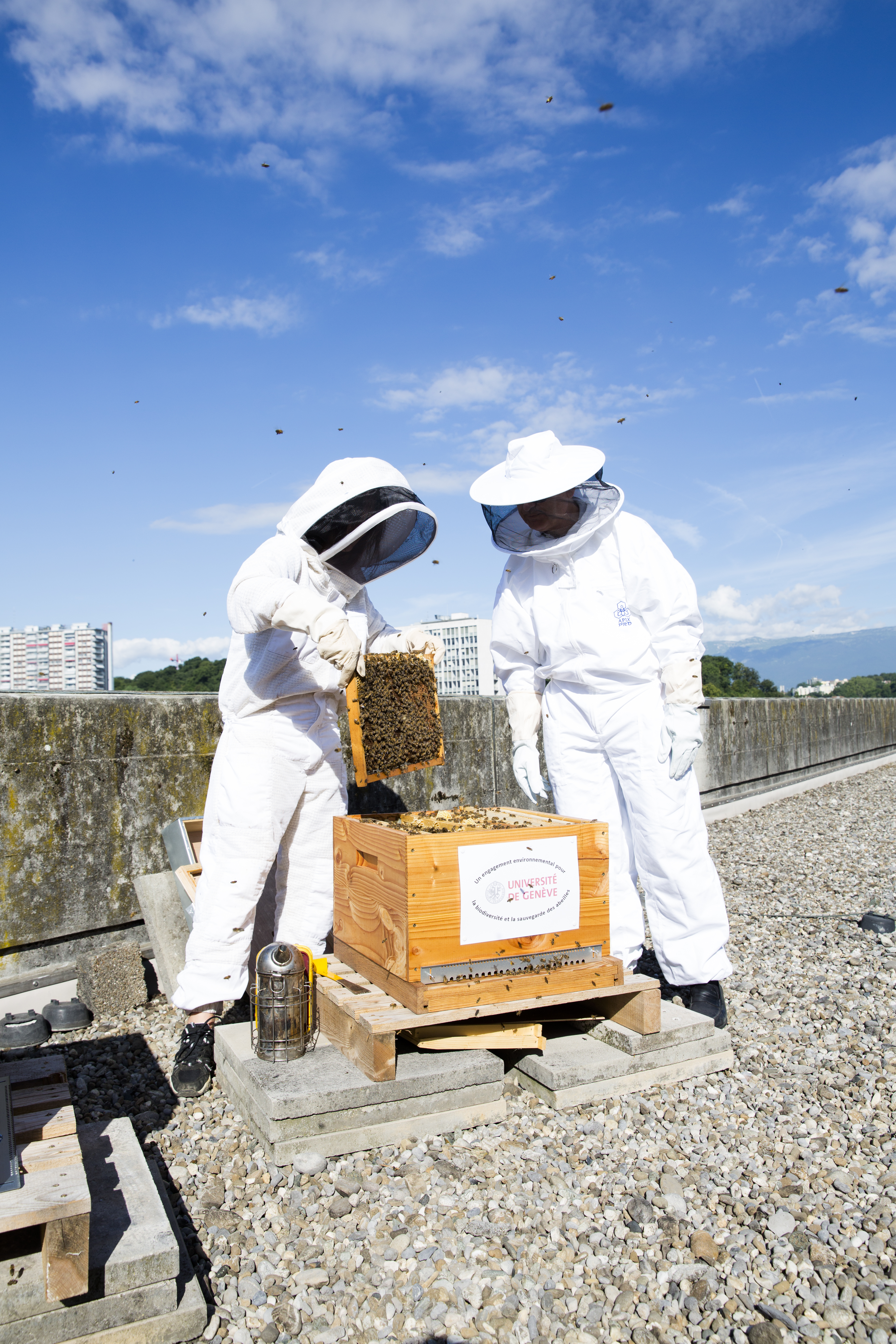 Ruches installées sur le toit de Sciences II. Projet de recherche s’inscrivant dans les actions en faveur du développement durable soutenues pour le Rectorat de l’UNIGE.